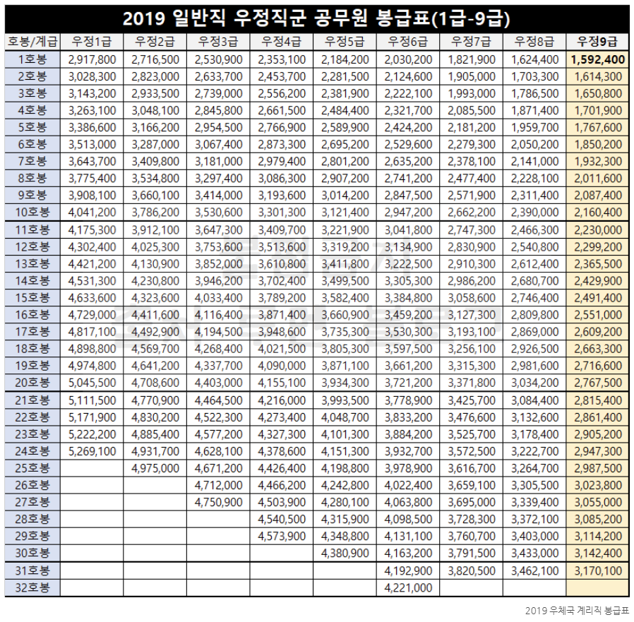 2019 일반적 우정직군 공무원 봉급표(1급~9급) - 우체국 계리직