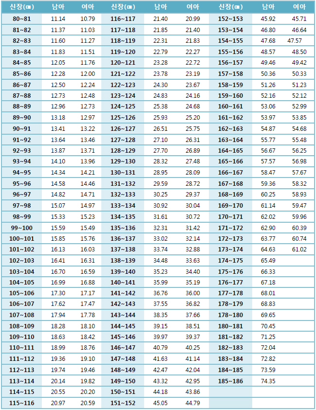 아까도 말씀드렸지만, 남자 표준 몸무게 올리는 김에 여자 정보도 같이 올려봅니다. 아무쪼록 해당하는 정보를 찾아보신 분들에게 약간의 도움이 되었으면 합니다.